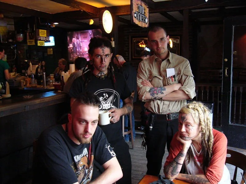 Meine Gesichts-Tattoos sind ein guter Filter. Entweder die Leute sehen hindurch, oder sie bleiben am Tattoo kleben und fragen dann eh nur die selben zwei Fragen: "Ist das echt?" und "Hat das nicht weh getan?" Ich habe unheimlich viele Freunde mit Gesichts-Tätowierungen; das ist für mich überhaupt nichts besonderes. Hier in der Küche arbeitet zum Beispiel mein Kumpel Jared. Er hat seine Tattoos zwar erst seit einem guten Jahr, ist aber kein gutterpunk oder oogle (in etwa: "Poser", "Pfeife", "verwahrloster Loser"), sondern meint es Ernst. Das kann man schon daran sehen, dass seine Gesichts-Tattoos teils abgefallen sind; er hat sie sich dann aber trotz der Vernarbungen gleich neu stechen lassen. Naja, meine Tattoos sind jedenfalls viel älter.
